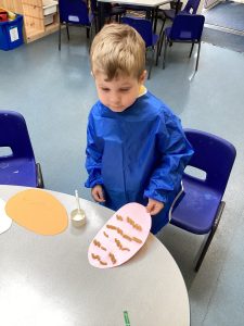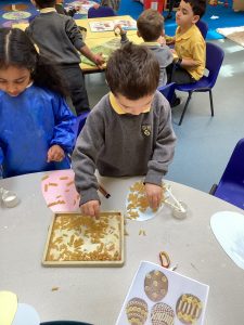 Throughout the week, the children took part in a range of hands-on activities. They explored measuring by scooping rice into Easter eggs and using language such as full, empty, heavy and light. The children also enjoyed decorating their own Easter eggs using pasta, creating patterns and developing their fine motor skills. They also had an Easter egg hunt to complete in the forest. They showed great resilience in finding all 20 eggs! The children had lots of fun searching for hidden eggs and worked together brilliantly.