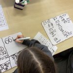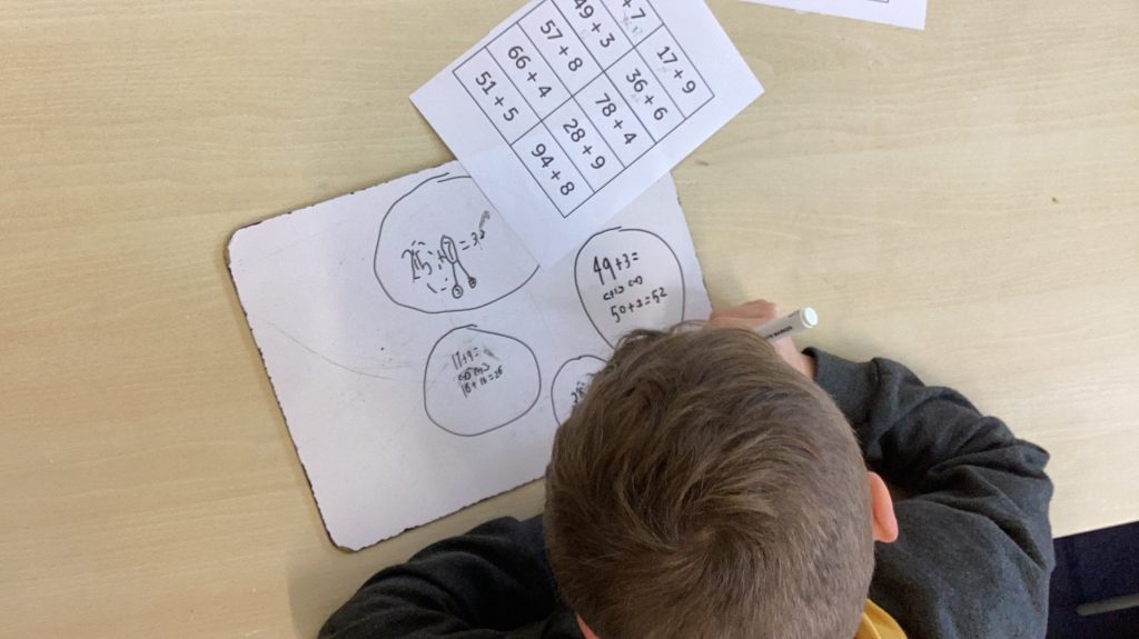We used our whiteboards and pens to work through the problems step by step. We also used a part-part-whole model to help us see how numbers can be split and adjusted. These strategies help us solve tricky additions in a smart and efficient way!